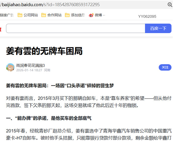 让他放心签单的,是华鑫邢总的一句口头承诺:“车你先开,牌照我们负责办,车贷不着急还,砂厂这么多人都能作证。”在姜有雲看来,“能合法上路”是买车的前提——没人会花钱买一辆不能拉活儿的废铁。