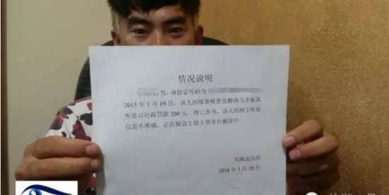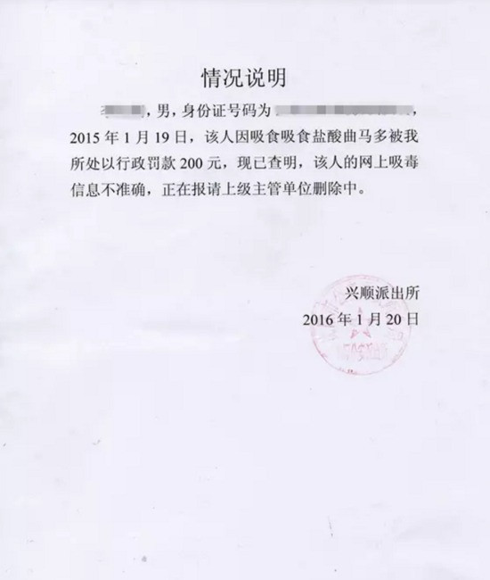 2016年1月20日,兴顺派出所出具了一张《情况说明》,该说明称,2015年1月19日,李明“因吸食盐酸曲马多被我所处以行政罚款200元,现已查明,该人的网上吸毒信息不准确,正在报请上级主管单位删除中”,并盖有兴顺派出所公章。