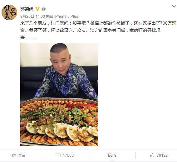 8月25日,郭德纲在微博回应近日传言:“来了几个朋友,进门就问:没事吧?微信上都说你被捕了,还在家搜出了700万现金。我笑了笑,闲谈数语送走众友。淡定的回身关门后,我疯狂的寻找起来……”幽默的同时还不忘晒出照片,告诉大家自己很好。