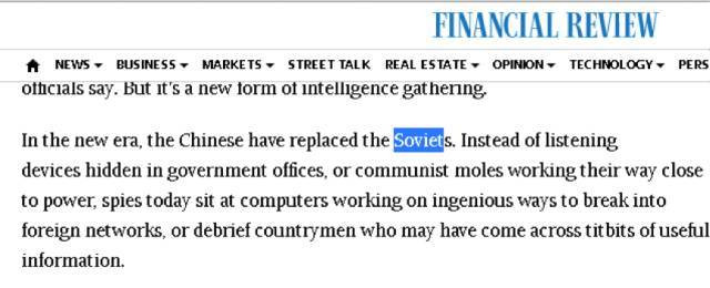 (图为澳大利亚媒体近日发表的一篇文章,宣称中国派出成千上万的间谍潜入澳大利亚,并称中国已经取代苏联,是澳大利亚的威胁)