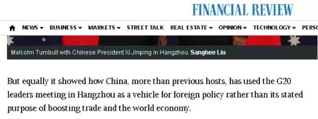 (澳大利亚媒体今天发布的一篇报道,称中国在G20上没有谈经济,而是把G20当成传销自己外交政策的工具)