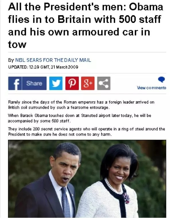(图为2009年英国媒体曝光奥巴马当时去英国访问时,仅随从人员就多达500人!)