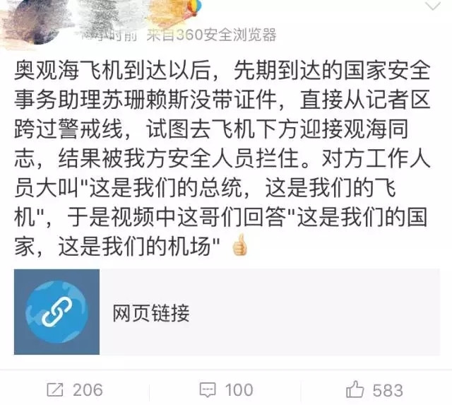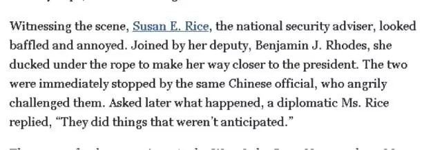 之后,当先前抵达的美国国家安全顾问赖斯,想从记者区横穿过去与奥巴马会合时,被一名中方安保人员劝阻,两人还进行了一番纠缠。其中,没有带任何证件的赖斯,想凭借“刷脸”和“嘴巴”就让安检人员给她放行,称这是“我们的总统,我们的飞机”。